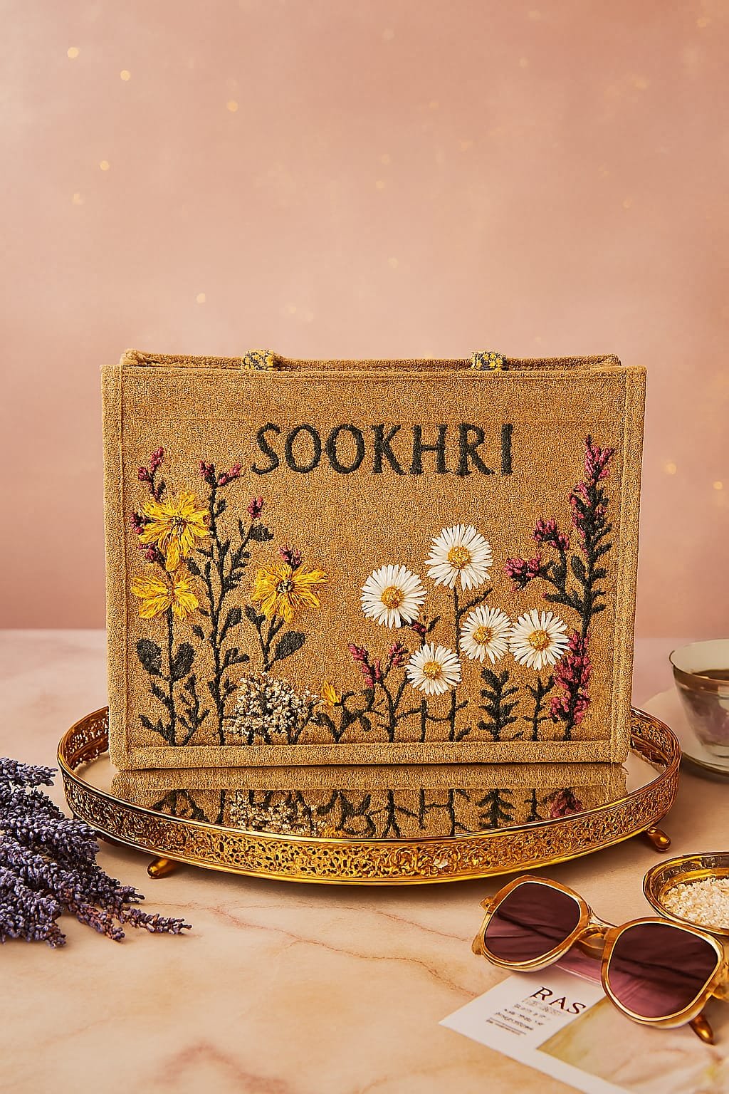 The “SOOKHRI” Tote: A rectangular, textured tan bag featuring the word “SOOKHRI” prominently embroidered in black. The lower half of the bag is adorned with intricate floral embroidery, showcasing white and yellow daisies with pink and green foliage.